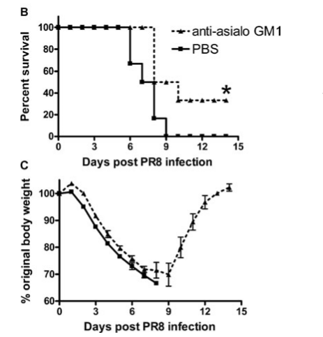 文獻來源:Zhou G, et al. 2013. Eur. J. Immunol. 43:929. 該圖顯示尾靜肪注射anti-asialo GM1或PBS,同時用流感病毒處理,并且每天監(jiān)測小鼠存活率(B)和小鼠體重(C)。顯示,消耗NK細胞增加流感病毒感染小鼠的致病率和致死率。