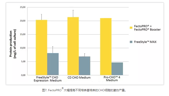 圖1. FectoPRO?大幅提高懸浮CHO細(xì)胞的抗體產(chǎn)量。按1×106個(gè)細(xì)胞/ml的密度將細(xì)胞培育在30ml的無(wú)血清培養(yǎng)基中,并依照每種試劑說(shuō)明書(shū)推薦用量FectoPRO?(0.8 μg DNA/ml)或FreeStyle?MAX試劑(1.25 μg DNA/ml)進(jìn)行轉(zhuǎn)染。用蛋白質(zhì)G生物感應(yīng)器(fortéBIO? octet RED96 system)對(duì)重組小鼠IgG的產(chǎn)量監(jiān)測(cè)1~6天。——ProteoGenix SAS(法國(guó))提供的數(shù)據(jù)。
