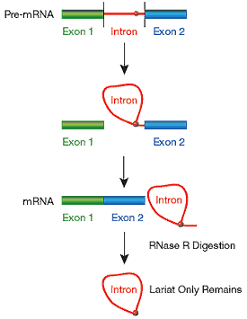 隨著環(huán)狀RNA的深入研究,環(huán)狀RNA制備問題就越來越備受關(guān)注。Lucigen提供大腸桿菌來源的RNase R,是一種Mg依賴性的3’ →5’核糖核酸外切酶,能消化基本上所有線性RNA,但不消化套索或環(huán)狀RNA的結(jié)構(gòu),或者3’突出短于7個核苷酸的雙鏈RNA。即是除了tRNA,5S RNA和內(nèi)含子套索結(jié)構(gòu)外,大多數(shù)細(xì)胞RNA都將被RNase R完全消化。如圖4,RNase R可從總RNA中分離出內(nèi)含子前體mRNA剪切產(chǎn)生的套索RNA。以這種方法獲得的RNA作為模板來生產(chǎn)標(biāo)記的cDNA,可作為含有潛在的內(nèi)含子序列的微陣列的目標(biāo),或者用于包含完整的染色體或者基因組的重疊區(qū)域平鋪陣列。產(chǎn)生的cDNA不代表線性內(nèi)含子,但其含有的序列是來源于內(nèi)含子的。