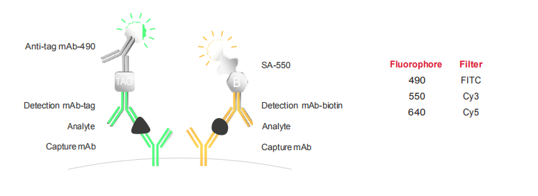 FluoroSpot能夠分析抗原特異性的多功能T細胞,例如,IFN-γ和IL-2的分析。三明治夾心結構在熒光斑點中得以應用,不同特異性的單克隆捕獲抗體混合物被包被于96孔板的PVDF膜上,生物素標記的檢測抗體識別一種分泌物,tag標記的檢測抗體識別其它的分泌物來實現雙色或三色細胞因子分泌細胞的檢測。檢測通過帶有特定熒光基團的共軛試劑放大信號斑點,可用自動讀板器進行分析。