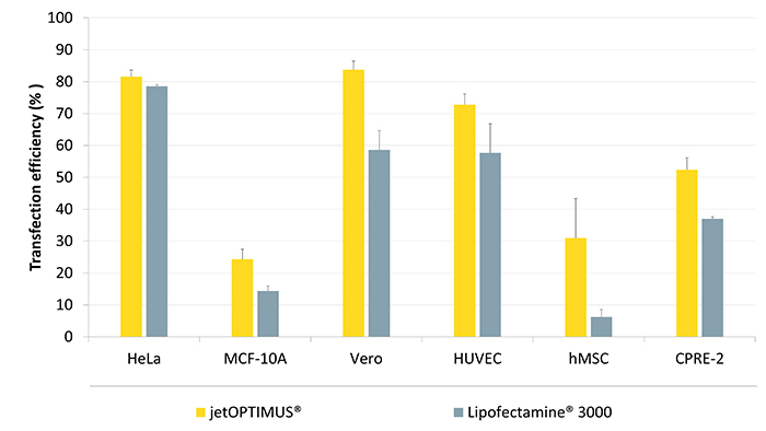 △圖1. jetOPTIMUS?有效提高難轉(zhuǎn)細(xì)胞的轉(zhuǎn)染效率。根據(jù)L3K和jetOPTIMUS?說(shuō)明書要求進(jìn)行轉(zhuǎn)染,在24孔板中轉(zhuǎn)染GFP質(zhì)粒到多種細(xì)胞系,24小時(shí)后采用FACS檢測(cè)轉(zhuǎn)染效率。