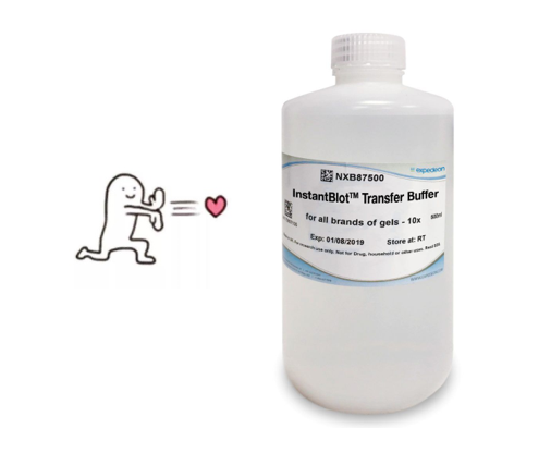 當(dāng)然蛋白電泳只是WB實(shí)驗(yàn)的第一步,那還有什么方法能加快后續(xù)實(shí)驗(yàn)(如轉(zhuǎn)膜)進(jìn)程呢?別急,今天就給大家介紹一款來(lái)自分子產(chǎn)品專(zhuān)家Expedeon公司的快速轉(zhuǎn)膜液——InstantBlot?Transfer Buffer(貨號(hào):NXB87500),作為Expedeon的一款專(zhuān)利產(chǎn)品,該轉(zhuǎn)膜液能夠大幅提升蛋白從“膠”至“膜”的轉(zhuǎn)移速度,最快只需10 min即可完成轉(zhuǎn)膜,并且不會(huì)產(chǎn)生過(guò)多的熱量,避免影響蛋白的后續(xù)檢測(cè)。