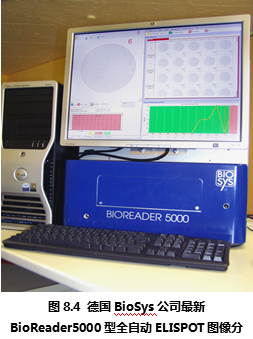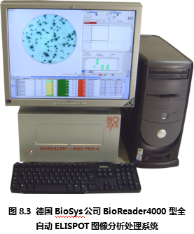 德國Bio-Sys公司從上世紀(jì)80年代開始就致力于生物圖像識別領(lǐng)域,在進入ELISPOT圖像分析儀市場后一直以其先進的ELISPOT斑點識別技術(shù)聞名。德國Bio-Sys公司首先解決了顯微攝像系統(tǒng)難以定位96孔板上的每一個孔的問題。其解決方法基于圖像識別技術(shù),利用板孔邊壁和真正的孔底的細(xì)微差別,在機械定位的基礎(chǔ)上,通過軟件識別來進一步提高每孔的定位精度。是目前市場上所有ELISPOT圖像分析儀中唯一能夠完整識別整個孔底ELISPOT斑點圖像的設(shè)備。在對真假斑點的分辨中,德國Bio-Sys公司除了具備完善的物理學(xué)多參數(shù)識別技術(shù),還特別針對ELISPOT斑點形成的生物學(xué)過程,通過細(xì)胞因子顯色后的“光密度”峰值積分分析方法,精確分辨真假斑點、融合斑點等復(fù)雜情況。Bioreader系列ELISPOT圖像分析儀國外大多數(shù)較有經(jīng)驗的ELISPOT實驗室推崇的特點為:專業(yè)性和參數(shù)全開放性。因為ELISPOT實驗的復(fù)雜性,ELISPOT斑點形成在不同的實驗條件下有非常大的差異。這就對ELISPOT圖像分析儀提出了較高的要求:既要能夠保證斑點計數(shù)的真實性和一致性,又要能夠根據(jù)不同情況,通過實驗者的判斷來校正儀器對ELISPOT斑點識別的標(biāo)準(zhǔn)。要同時實現(xiàn)以上兩個要求,唯一的辦法是將儀器的所有判斷標(biāo)準(zhǔn)向ELISPOT實驗者開放,實現(xiàn)實驗者和儀器的互動。在這一方面,德國Bio-Sys公司始終走在ELISPOT斑點識別領(lǐng)域的前列,新的Bioreader-4000型(圖8.3)和Bioreader -5000(圖8.4) 型在專業(yè)性和適用性方面都領(lǐng)先于其他廠家的設(shè)備。