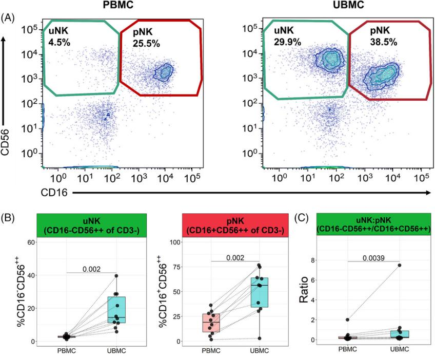 Kahn等人采用了一種從胎盤床收集白細(xì)胞的技術(shù),即在剖腹產(chǎn)后使用手術(shù)海綿擦拭子宮腔。這種方法通常用于確保胎盤從子宮腔中完全移除并清除多余血液,因此不會(huì)給患者帶來額外的風(fēng)險(xiǎn)。本文采用這種方法分析胎盤床NK細(xì)胞、T細(xì)胞、B細(xì)胞和單核細(xì)胞的表型,并與外周血樣本中對(duì)應(yīng)細(xì)胞進(jìn)行比較。