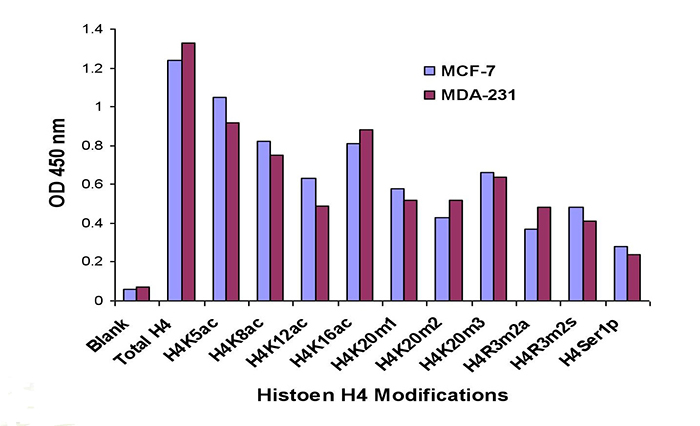 該試劑盒檢測H4修飾位點:H4K5ac、H4K8ac、H4K12ac、H4K16ac、H4R3m2a、H4R3m2s、H4K20m1、H4K20m2、H4K20m3、H4ser1、TotalH4