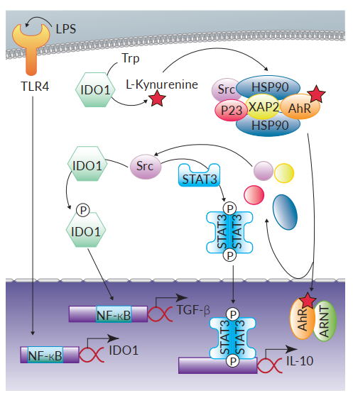 AhR參與調(diào)節(jié)促炎反應和耐受反應的機制可以從多方面解釋,除了前文提過可以導致IL-22產(chǎn)生的典型AhR信號,AhR也通過非基因組途徑導致至少兩個抑制性效果。研究發(fā)現(xiàn)與AhR相關(guān)的Src激酶能夠磷酸化吲哚胺2,3-雙加氧酶(IDO1),進而激活NF-κB轉(zhuǎn)錄因子誘導DCs中抑制性細胞因子TGF-β(transforminggrowth factor)的轉(zhuǎn)錄,達到抑制小鼠對LPS的過度應答9。此外, IDO1對Trp的降解提供了例如L-型犬尿氨酸(L-Kynurenine)的AhR激動劑,提示了這通路與Treg的產(chǎn)生有關(guān)9。在巨噬細胞中,AhR另一個抑制作用是在LPS誘導下,AhR協(xié)同Src激酶和STAT3信號通路產(chǎn)生抗炎細胞因子IL-10。值得留意的是,TLR4對LPS的識別可促進巨噬細胞中AhR的表達,但目前尚不清楚在其他模式識別受體配體刺激的情況下是否也是如此10。