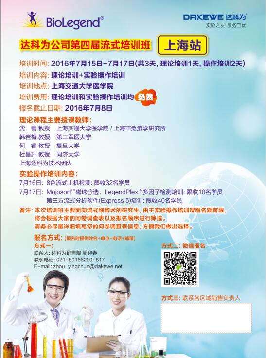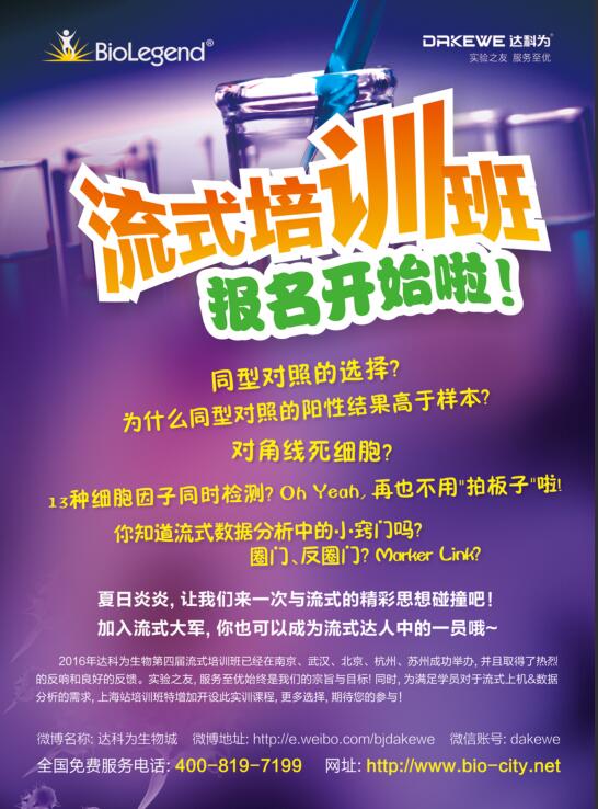 2016年達(dá)科為生物第四屆流式培訓(xùn)班已經(jīng)在全國(guó)各地火熱舉辦中,第七站上海培訓(xùn)班經(jīng)過前期的彩頁、海報(bào)的宣傳,報(bào)名工作已經(jīng)接近尾聲。目前上機(jī)課程已滿,理論課程還有部分名額,感興趣的學(xué)員,歡迎報(bào)名,期待您的參與!