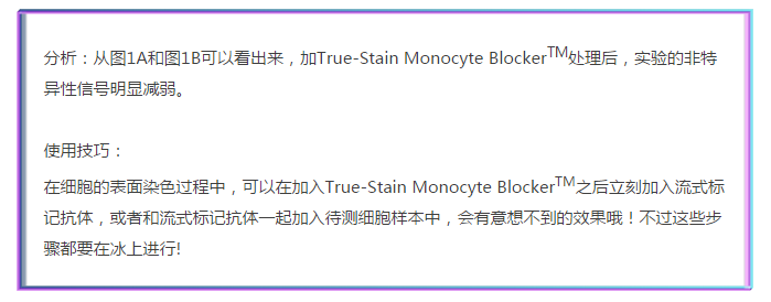 圖1A-B分別為T(mén)ruStain FcXTM阻斷和True-Stain Monocyte BlockerTM阻斷后的CD14 BV421TM和CD3 APC /Cy7共染結(jié)果圖。
