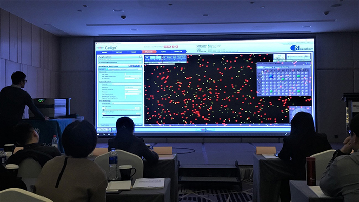 在Nexcelom中國(guó)區(qū)應(yīng)用科學(xué)家孫明偉博士操控下,Celigo應(yīng)用界面在超大的電子屏前一展風(fēng)采。其快速高效的掃描和分析能力躍然眼前!