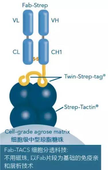 以Fab片段為基礎(chǔ)的無痕親和細胞分選技術(shù)(traceless affinity cell selection, Fab-TACS),由IBA Lifesciences根據(jù)其獨家的Strep-tag?/Strep-Tactin?蛋白純化系統(tǒng)發(fā)展而來。Fab-TACS運用免疫親和層析的原理,利用細胞表面抗原分子CD marker與Fab片段的特異性結(jié)合來進行捕捉及釋放目標細胞。以不具磁性且可逆的試劑,取代一般具高親和力的完整抗體, 直接由全血或其他血液樣本來進行溫和的標準化分選,因此能精準的提供您不含標記、未被活化的目標細胞。