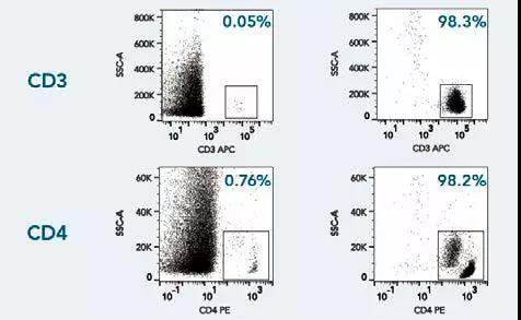 使用Fab-TACS細胞分選重力柱分離全血中的CD3+及CD4+免疫細胞。細胞樣本以CD3-APC (OKT-3)或 CD4-PE (OKT-4) 抗體染色后,進行流式分析,左右分別為分選前后的細胞群分布。死細胞以DAPI染色先行排除,并使用不同F(xiàn)SC/SSC信號來排除雙粘體和細胞碎片。結(jié)果顯示:即使直接處理全血,F(xiàn)ab-TACS科技仍能分離出高純度目標細胞。