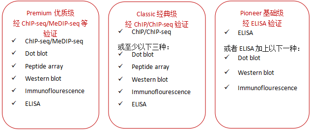 自2004年以來,Diagenode就與領(lǐng)先的表觀遺傳學(xué)專家和表觀遺傳學(xué)聯(lián)盟合作生產(chǎn)、驗證包括抗體在內(nèi)的表觀遺傳學(xué)試劑。2012年,Diagenode用一種創(chuàng)新、嚴謹?shù)目贵w分類系統(tǒng)改革了免疫沉淀技術(shù),用于表觀遺傳學(xué)研究。根據(jù)驗證水平將抗體分為三個不同級別,以幫助您建立選擇抗體的信心。最終,用您信任的抗體獲得滿意的結(jié)果。