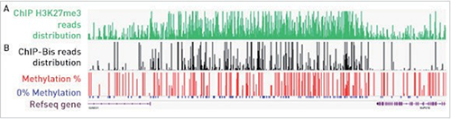 圖3 A: 使用Diagenode的iDeal ChIP-seq Kit對(duì)人細(xì)胞系Gm12878 H3K27me3標(biāo)記的組蛋白進(jìn)行染色質(zhì)免疫沉淀;B: 使用Premium WGBS Kit對(duì)ChIP’d DNA進(jìn)一步處理并測(cè)序。