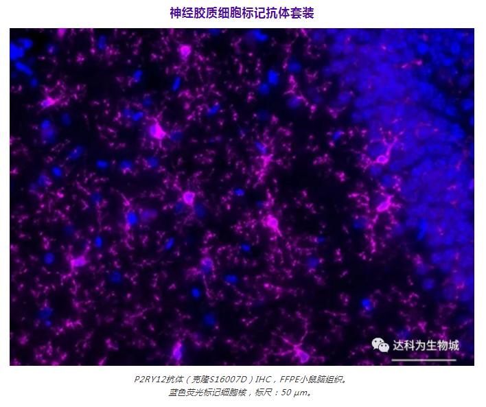 神經(jīng)膠質(zhì)細(xì)胞抗體套裝中包含檢測(cè)常見神經(jīng)膠質(zhì)細(xì)胞的標(biāo)記物,如趨化因子受體1抗體(CX3CR1)、膠質(zhì)纖維酸性蛋白(GFAP)、髓磷脂(Myelin)和嘌呤能受體(P2RY12)。其中的輔助試劑可以檢測(cè)各種屬磷酸化或總α-突觸核蛋白/Tau,這些聚集物與阿爾茨海默癥和帕金森皆有重大關(guān)聯(lián)。