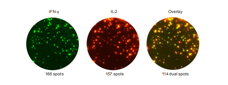 FluoroSpot能夠分析抗原特異性的多功能T細胞,例如,IFN-γ和IL-2的分析。三明治夾心結構在熒光斑點中得以應用,不同特異性的單克隆捕獲抗體混合物被包被于96孔板的PVDF膜上,生物素標記的檢測抗體識別一種分泌物,tag標記的檢測抗體識別其它的分泌物來實現雙色或三色細胞因子分泌細胞的檢測。檢測通過帶有特定熒光基團的共軛試劑放大信號斑點,可用自動讀板器進行分析。