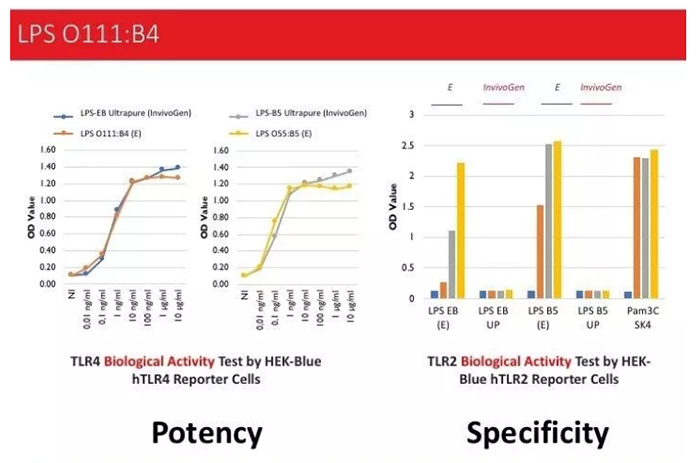 比較InvivoGen和E品牌TLR4特異性LPS(Utrapure)發(fā)現(xiàn),E品牌雖然號(hào)稱TLR4 specific agonist,但是可同時(shí)激活TLR2和TLR4,而InvivoGen的Ultrapure LPS只能特異性激活TLR4。