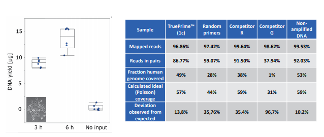 TruePrime?采用MDA技術(shù),基于新型的TthPrimPol 引物酶和Phi29 DNA聚合酶,擴增過程無需添加隨機引物,減少了擴增偏倚,提高了擴增過程的覆蓋率和保真性,并且對于污染的外源DNA不敏感,可重復(fù)性好。TruePrime?可用于單個細(xì)胞或少量細(xì)胞的全基因組擴增,與常見的NGS平臺如Illumina和IonTorrent等兼容性良好。