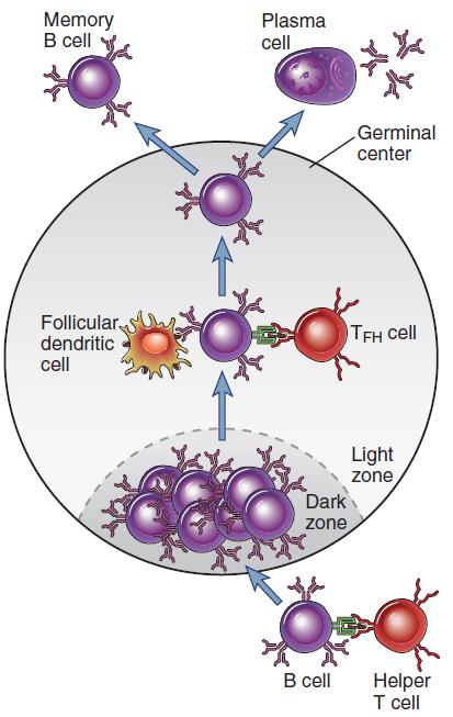 Tfh 細(xì)胞的主要作用是增加高親和力 B 細(xì)胞和長(zhǎng)壽漿細(xì)胞的形成,并幫助他們轉(zhuǎn)移到發(fā)生中心(GC)。在接受抗原刺激后,初始 B 細(xì)胞首次移動(dòng)到 T 細(xì)胞區(qū),且在來(lái)自 Tfh 細(xì)胞和抗原呈遞細(xì)胞的共刺激作用下開(kāi)始活化并形成發(fā)生中心。當(dāng)發(fā)生中心的 B 細(xì)胞開(kāi)始分化為漿細(xì)胞或記憶 B 細(xì)胞時(shí), Bcl-6 會(huì)阻止 B 細(xì)胞的增殖,因?yàn)?Bcl-6 可以抑制 B 細(xì)胞活化基因的表達(dá),如 CD69、 STAT1 和 CD80 等,同時(shí)也會(huì)通過(guò)調(diào)節(jié) Prdm1 來(lái)抑制發(fā)生中心的 B 細(xì)胞向漿細(xì)胞分化。 Tfh 細(xì)胞通過(guò) CD40 的作用致使 Bcl-6 轉(zhuǎn)錄沉默,從而促使發(fā)生中心 B 細(xì)胞存活和增殖。且在這一過(guò)程中,CD40L、PD-1、BAFF、IL-4 和 IL-21 等信號(hào)分子的參與也是必不可缺的。
