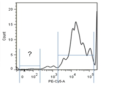 補(bǔ)償調(diào)節(jié)抗體的正確選擇對(duì)于熒光通道之間的補(bǔ)償調(diào)節(jié)是非常重要的。要求選擇的抗體所結(jié)合的抗原分子在樣本細(xì)胞中有明確表達(dá),占樣品細(xì)胞的10%以上,50%以下。如果陽(yáng)性細(xì)胞比例太低,在陽(yáng)性細(xì)胞區(qū)域無法形成明顯的細(xì)胞團(tuán),無法判斷調(diào)節(jié)是否合適。如陽(yáng)性細(xì)胞比例過高,則不表達(dá)該抗原的陰性細(xì)胞無法形成明顯的細(xì)胞團(tuán),如圖1-4直方圖所示。