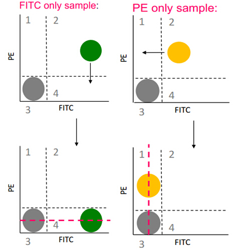 (3)PE單染管:同理,將進(jìn)入FITC探測(cè)器的PE信號(hào)通過補(bǔ)償調(diào)節(jié)來消除。
