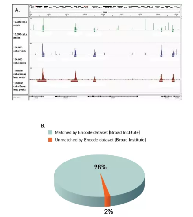 A、用Diagenode的H3K4me3抗體、True MicroChIP Kit進行ChIP實驗,10000個細(xì)胞中ChIP下來17pg DNA,對照組35pg DNA。IP下來的DNA用MicroPlex Library Preparation Kit擴增并被轉(zhuǎn)化為可用于Illumina?平臺測序的文庫,通過IlluminaR Genome Analyzer分析文庫,根據(jù)說明書進行簇生成和測序。