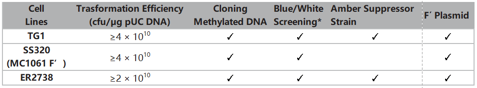 最高轉(zhuǎn)化效率的TG1感受態(tài)細(xì)胞,轉(zhuǎn)化效率≧4×1010 cfu/μg;