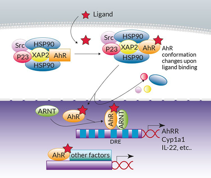 典型AhR訊號已經(jīng)被廣泛綜述過1。簡而言之,在沒有配體的情況下,AhR位于細胞質(zhì)中Hsp90:XAP2:p23:Src伴侶蛋白復合物內(nèi),當配體結(jié)合時,復合物發(fā)生構(gòu)象變化并轉(zhuǎn)移到細胞核中。伴侶蛋白被釋放,AhR和AhR核轉(zhuǎn)位子(ARNT)異源二聚。在細胞核中,AhR:配體:ARNT三聚體與AhR靶基因上游調(diào)節(jié)區(qū)域的二噁英應答元件(DRE)結(jié)合,以控制包括細胞色素P450依賴性單加氧酶Cyp1a1、AhR 抑制因子(AhRR)和IL-22白細胞介素的轉(zhuǎn)錄。值得注意的是,無輪是在基因組水平上通過與其他轉(zhuǎn)錄因子(例如NF-κB)相關(guān)聯(lián),還是在非基因組水平上(例如通過釋放Src激酶),非典型AhR信號通路也有被報道過2,3。